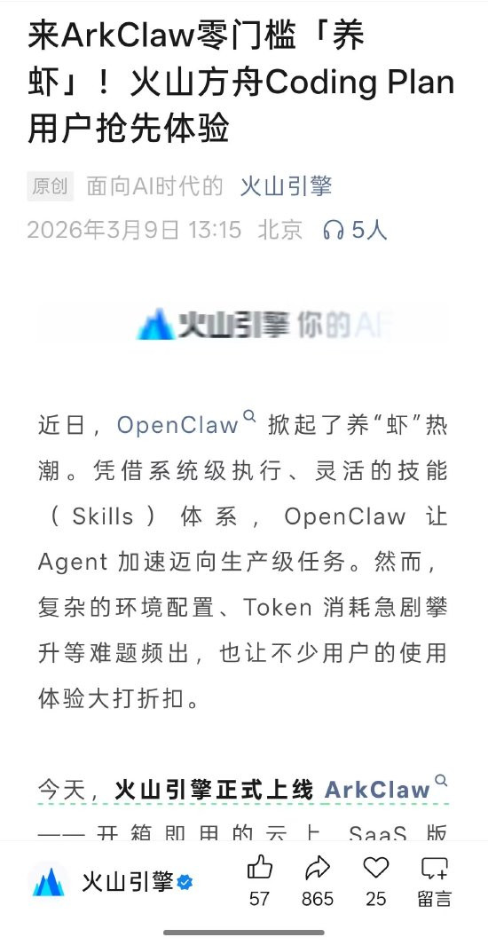 官方表示,“火山方舟CodingPlan”用户可以抢先体验ArkClaw,“CodingPlanPro”用户登陆即可同步使用ArkClaw,“CodingPlanLite”用户可以免费体验7天。