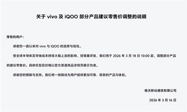 根据vivo在官网发布的《关于vivo及iQOO部分产品建议零售价调整的说明》(以下简称说明),3月18日10点起,调整(上调)部分产品的建议零售价。